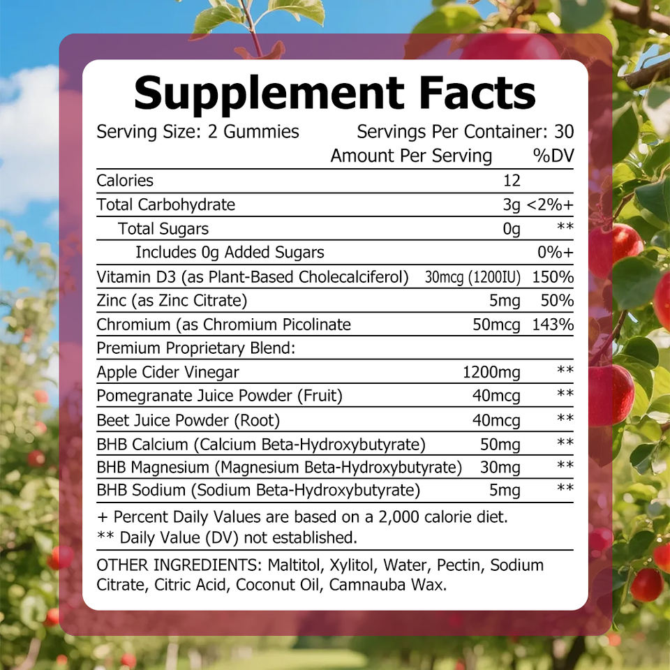 Ingrediente principal:Vinagre de sidra de manzana, Vitamina B6, Cromo, Polvo de jugo de granada, BHB Calcio