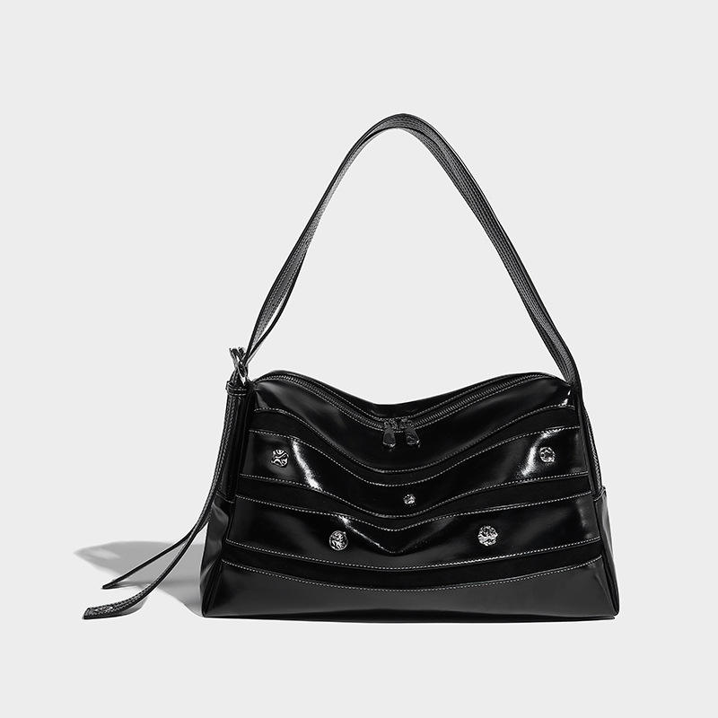 Venta directa de fábrica bolso de hombro patchwork marrón oscuro, cuero brillante, gamuza, remaches de metal, bolso de mujer vintage