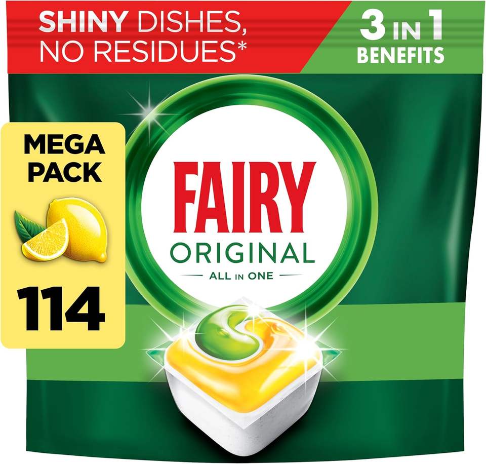 Pastillas para Lavavajillas Fairy Todo en Uno, Paquete Grande, Pastillas para Lavavajillas Fairy, 114 Pastillas, Limón, Eficaz Incluso Con Grasa Seca