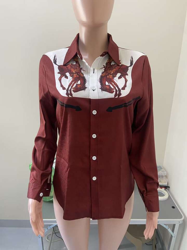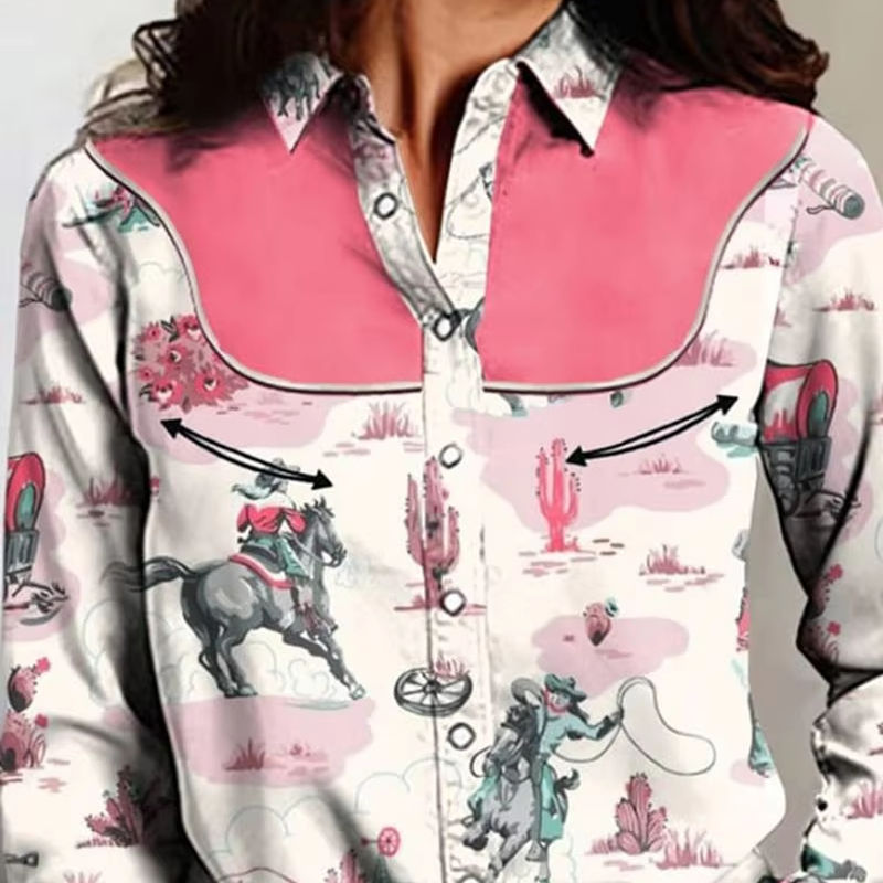 Camisa Retro Western de Manga Larga con Botones para Mujer, Estampado Vintage de Caballos y Cactus, Transpirable, Estilo Casual para Verano e Invierno