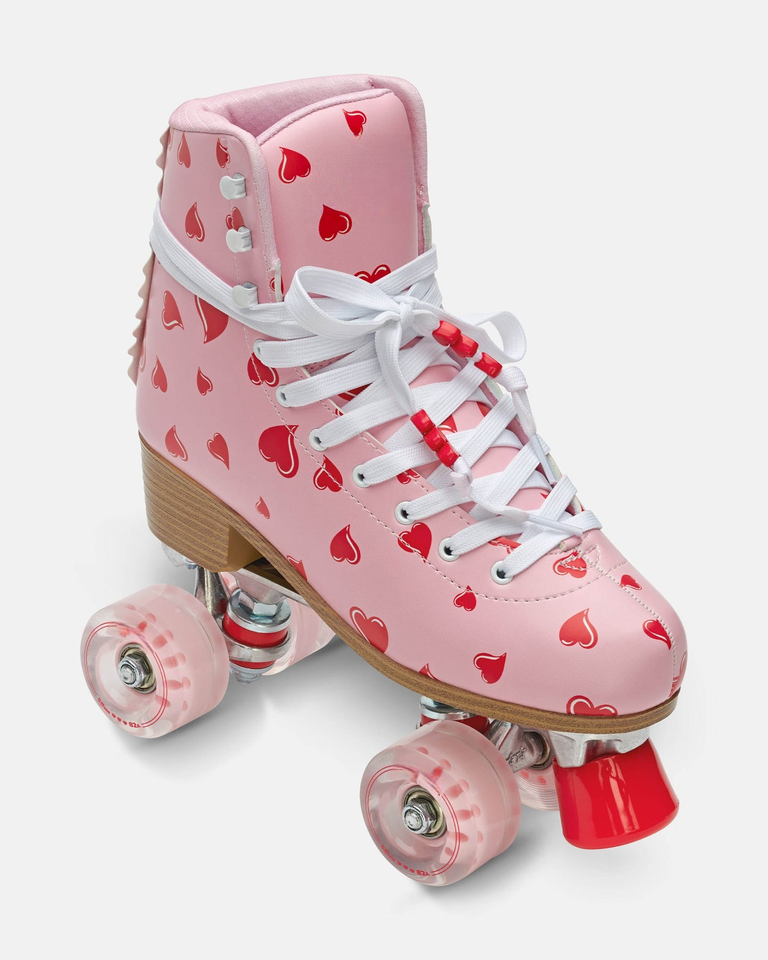 Patines de Ruedas Cuádruples Falling Hearts para Mujer, Lindos Patines Retro de Cuero Vegano Rosa para Uso en Interiores y Exteriores