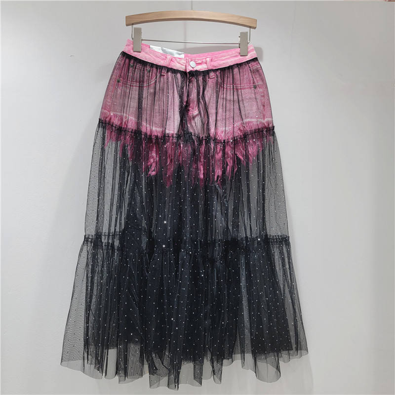 Falsa Minifalda vaquera de 2 piezas con borde crudo con superposición de malla con tachuelas de diamantes Sehe Fashion
