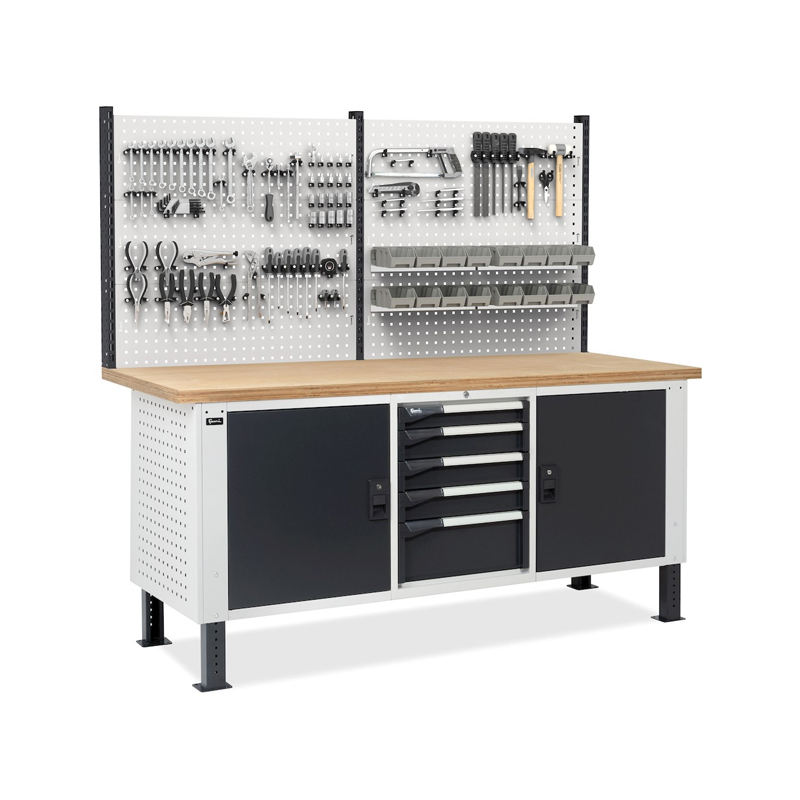 Banco de trabajo ajustable Fami Master BR 200cm con encimera de madera, 4 cajones, 2 armarios y pared perforada