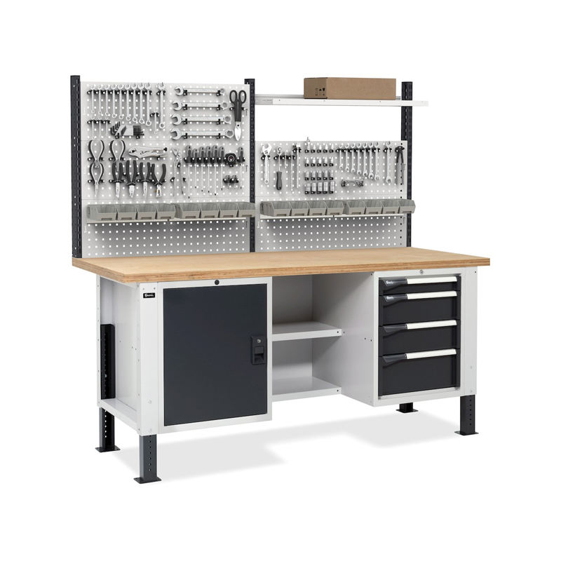 Banco de trabajo ajustable Fami Master BR 200cm con tapa de madera, 4 cajones, armario y pared perforada