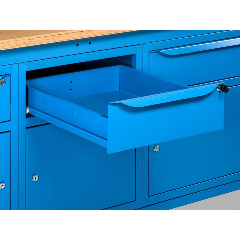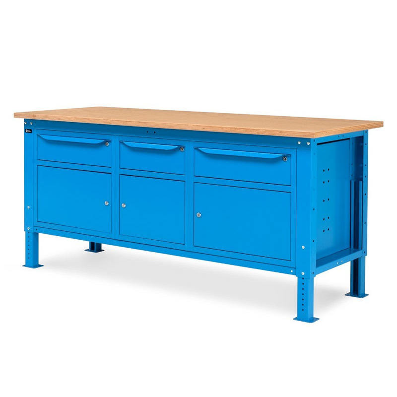 Fami WORK2012 banco de trabajo ajustable, 200cm, azul, tapa de madera, 3 armarios y 3 cajones
