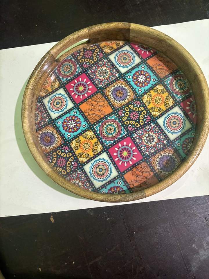 Bandeja Decorativa de Madera de Mango con Diseño de Estilo Famoso y Estampado Esmaltado, Bandeja de Servir de Madera con Impresión Esmaltada a un Precio Muy Bajo