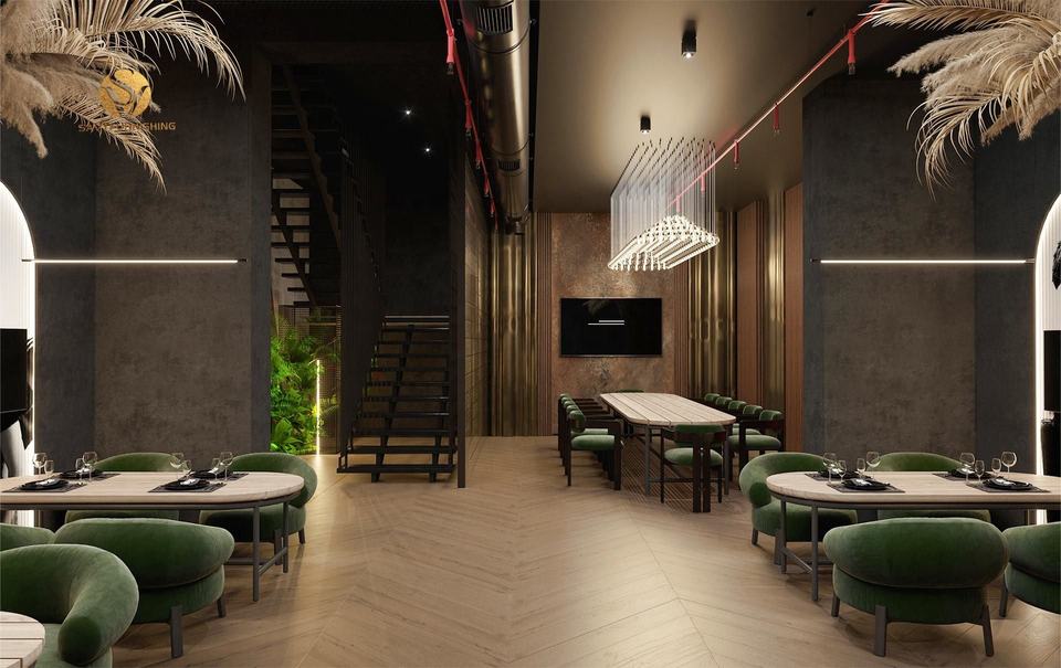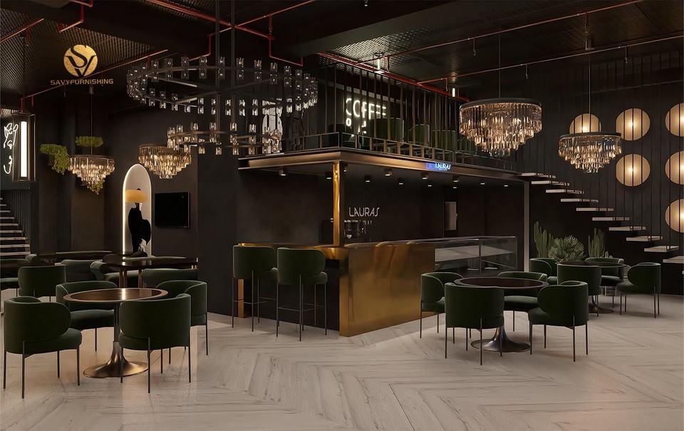 Plan de Diseño Interior de Cafetería Elegante, Mostrador Dorado para Exhibición de Pasteles, Conjunto de Comedor Moderno para Cafetería y Restaurante, Sillón de Terciopelo