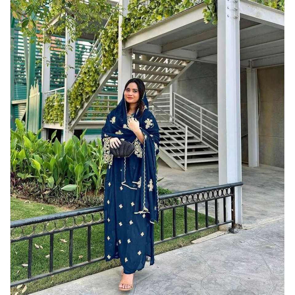 Top y pantalón de trabajo con secuencia bordada Georgette elegante con cielo Dupatta