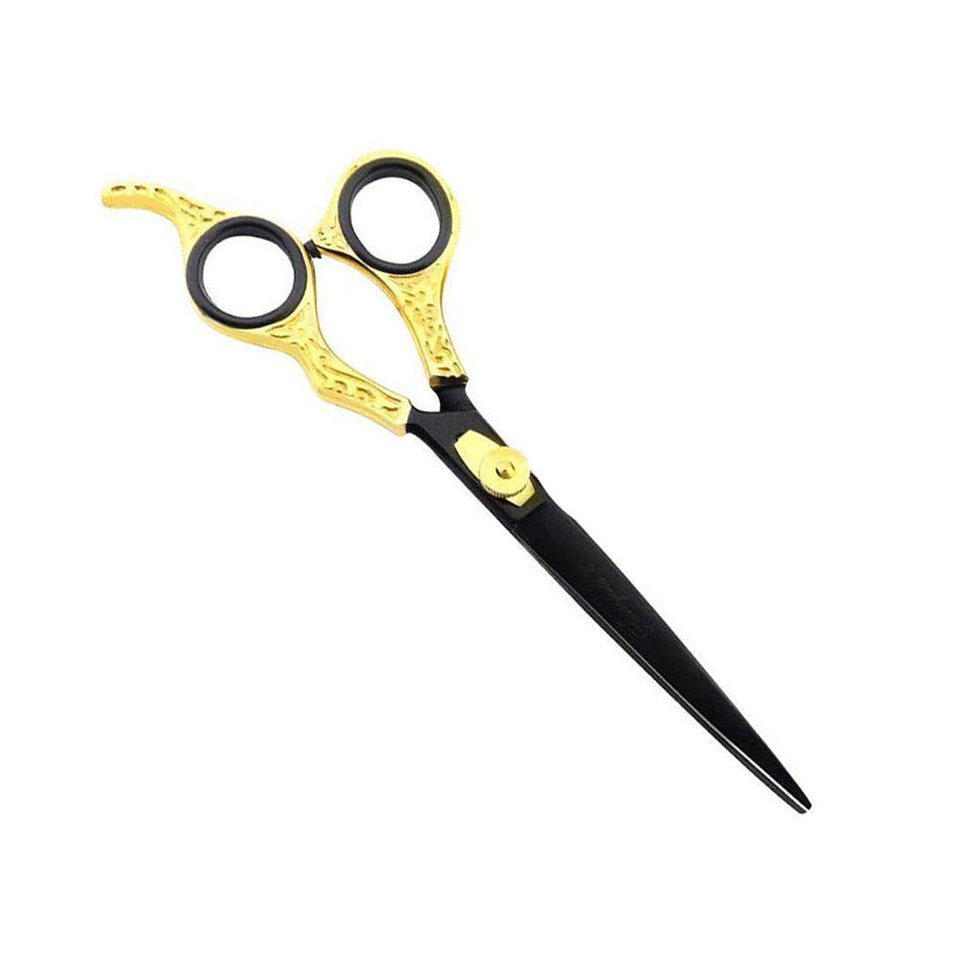 Tijeras de peluquería con mango elegante, hoja afilada recubierta de acero metálico negro con reposapiés fijo