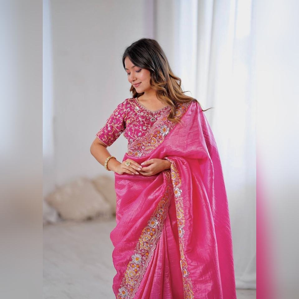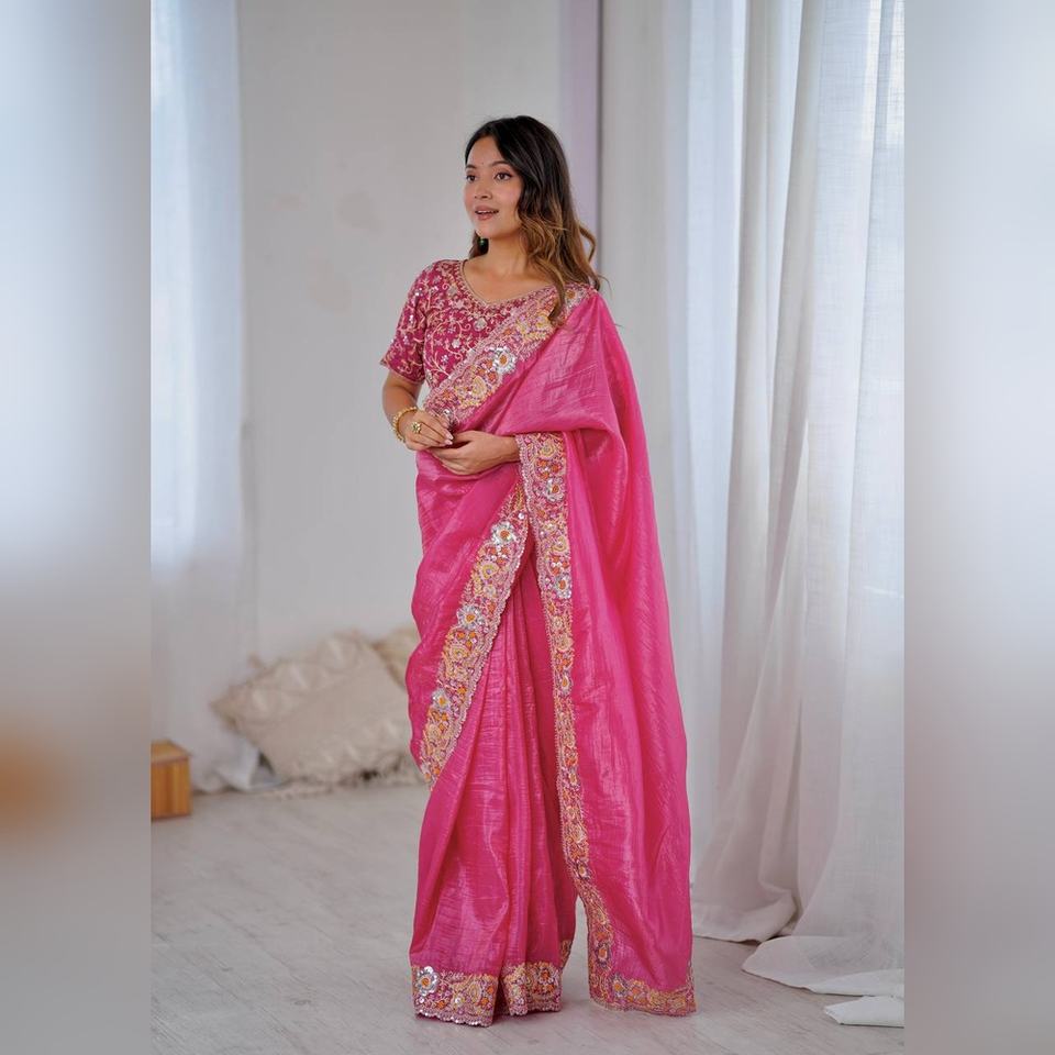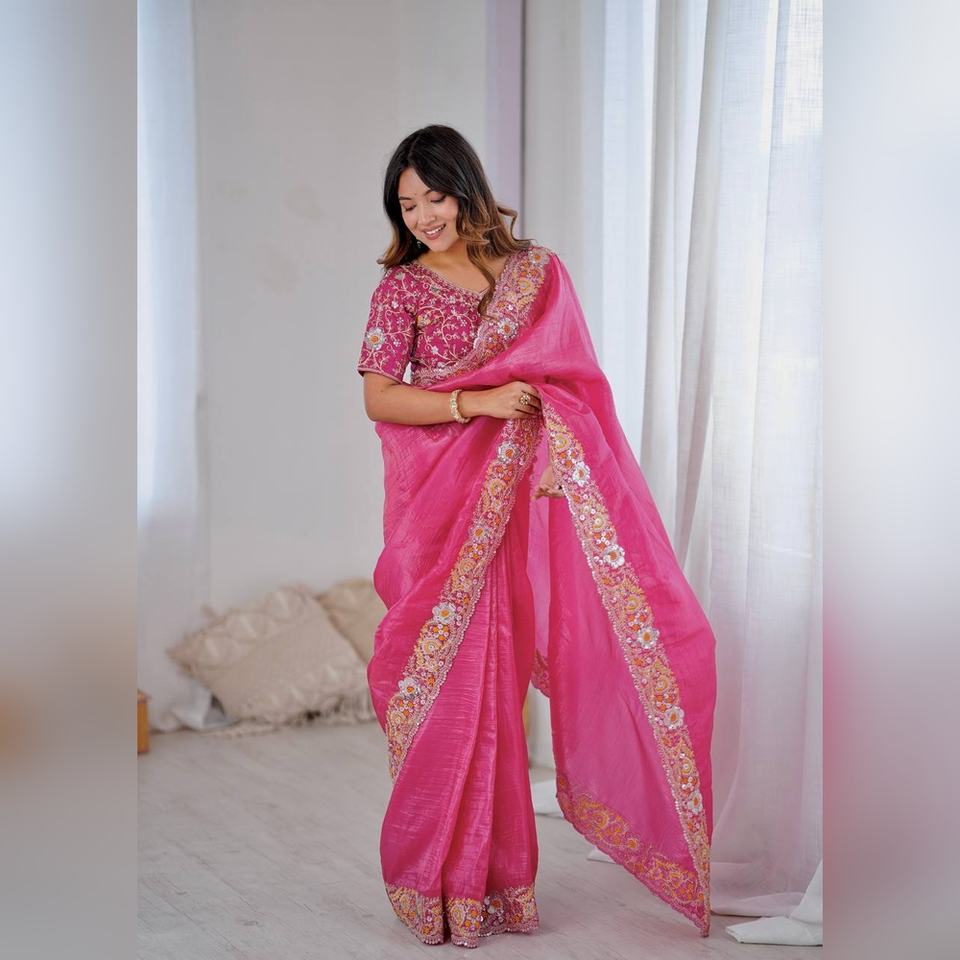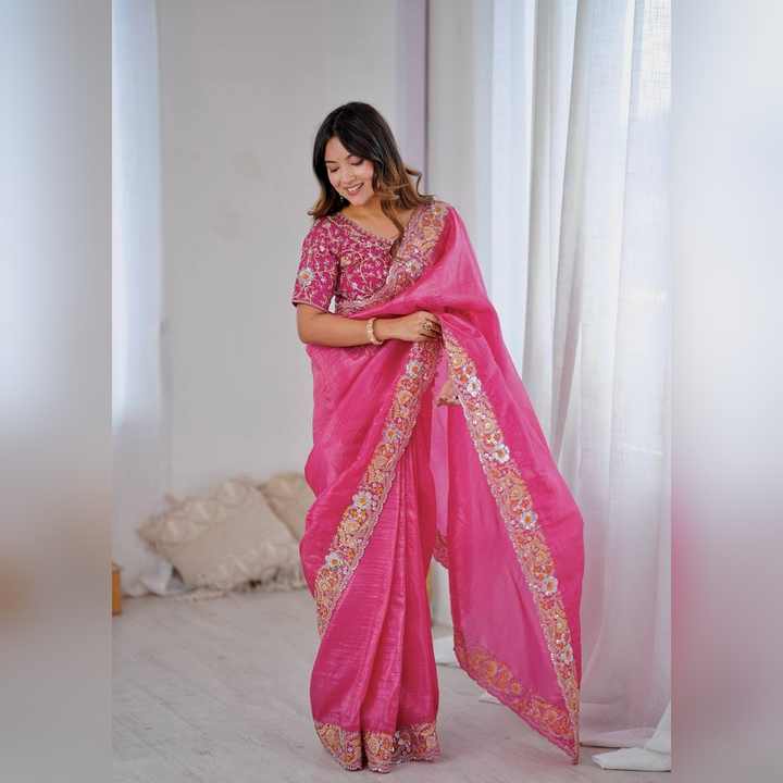 Sari de Seda Mono Premium Noha Crush Sin Coser con Blusa, Bordado Pesado con Lentejuelas, para Fiestas y Bodas