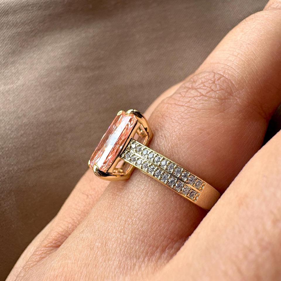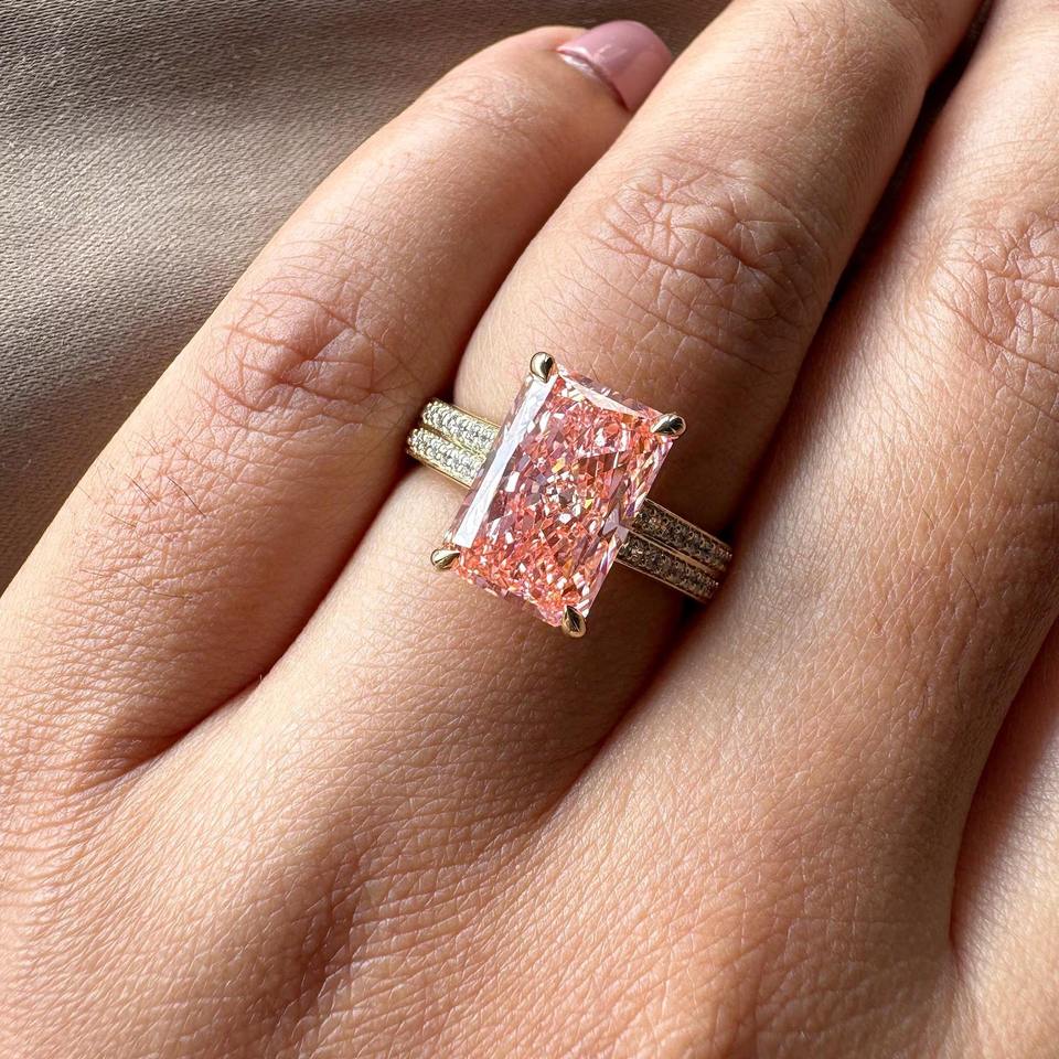 Anillo de Compromiso con Diamante Cultivado en Laboratorio, Corte Esmeralda, Color Rosa Fantasía, con Certificado IGI, Anillo de Boda de Dos Bandas para Regalo de Aniversario
