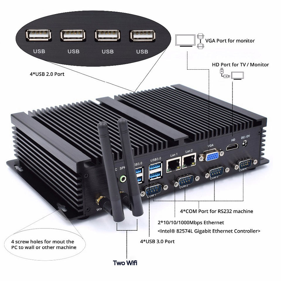 Puertos::4 * COM.1 * HD, 2 * Gigabit Lan, 4 * USB 3,0, 4 * USB2.0,1DC,1ON/OFF