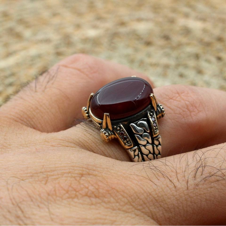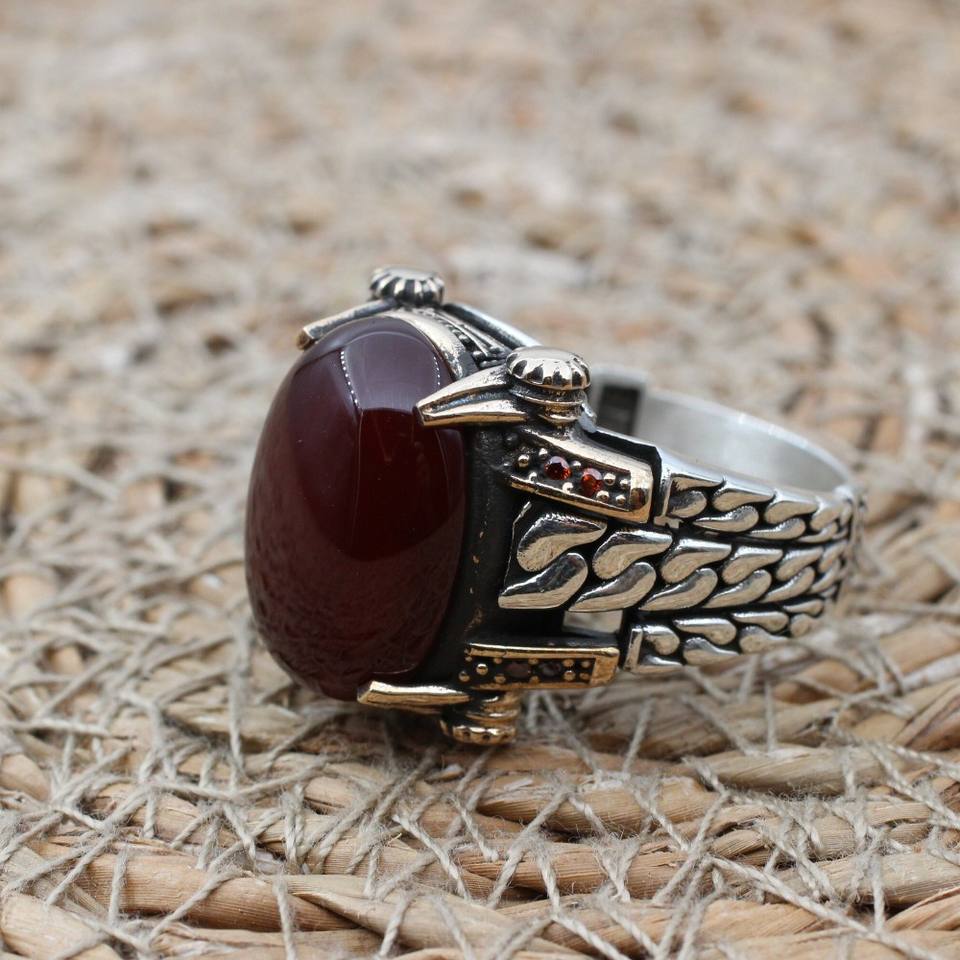 Palabra clave:Rojo sangre ágata mens vinatge anillo 925 plata esterlina joyería única