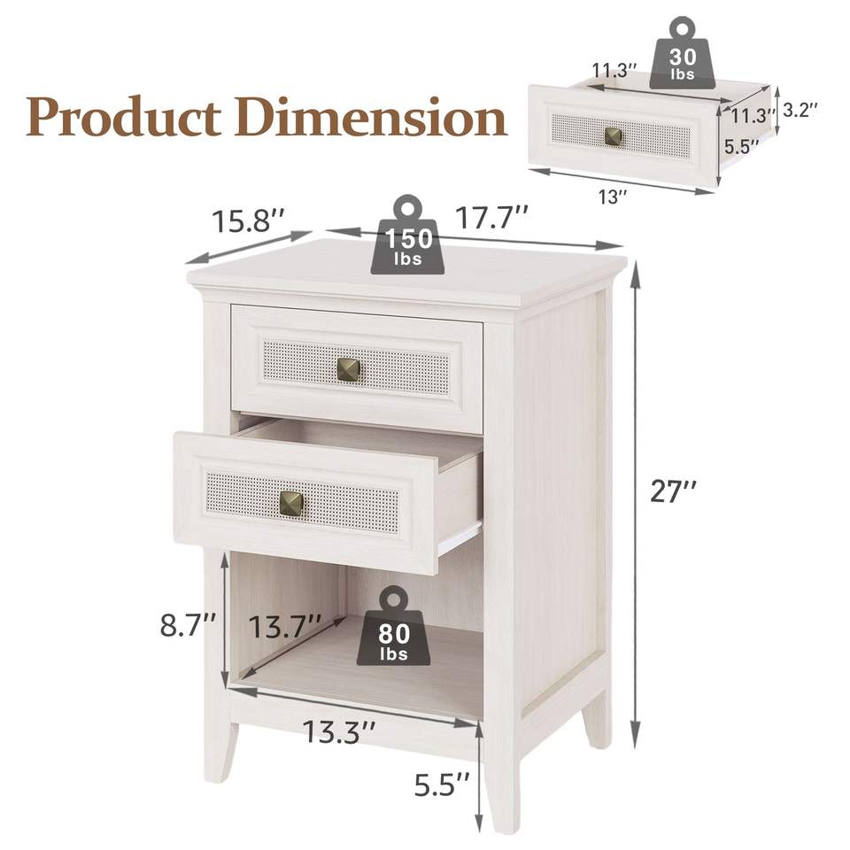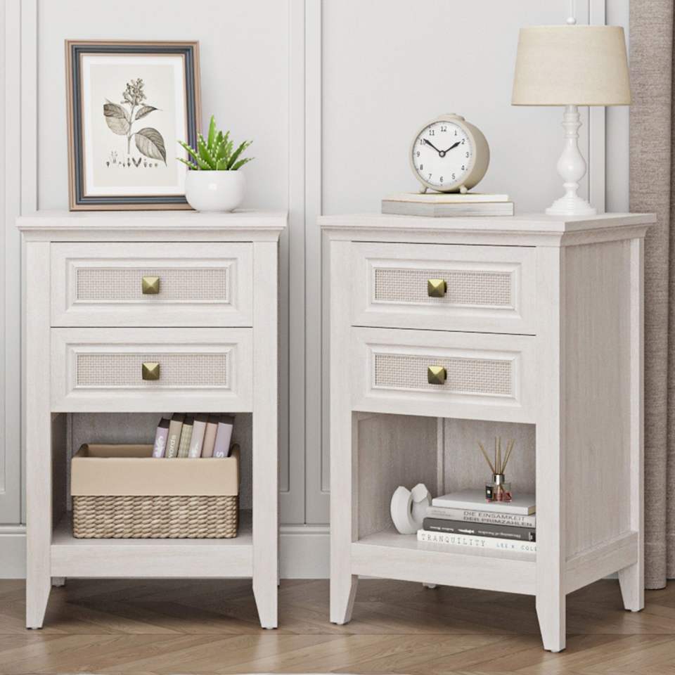 Mesita de Noche Estilo Rústico con 2 Cajones Decorativos de Ratán, Mesa Auxiliar Boho con Estante Abierto y Detalles de Cómoda