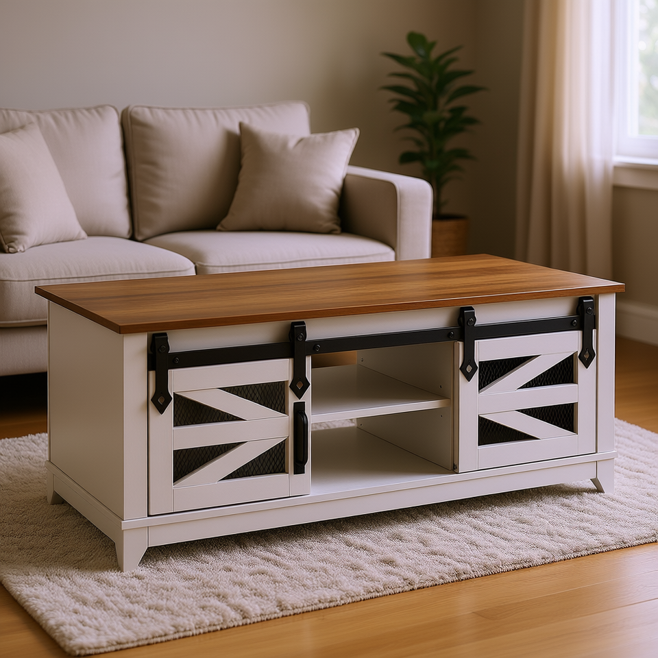 Mesa de Centro Rectangular Estilo Rústico de 48 Pulgadas con 2 Puertas Corredizas y 2 Niveles con Estantes Extraíbles de Madera para Sala de Estar