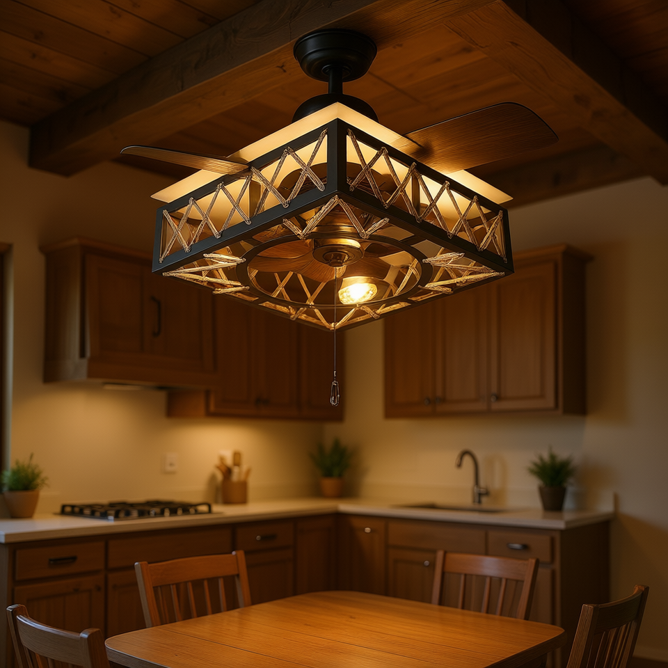 Ventilador de Techo LED Cuadrado con Rejilla, Estilo Industrial, 6 Velocidades, Motor DC, Control Remoto, Luz Cálida, para Cocina y Comedor
