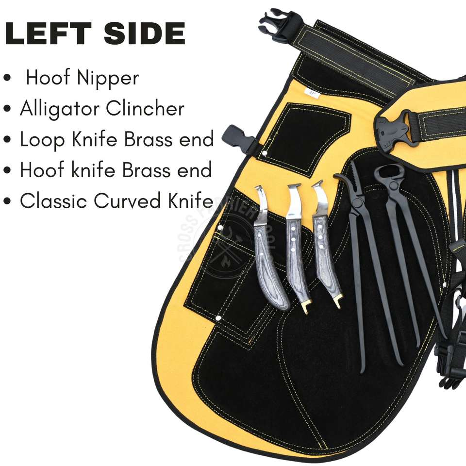 Material:Kit de herramientas de herrador de acero inoxidable para recorte de pezuñas y juego de delantal de herrador