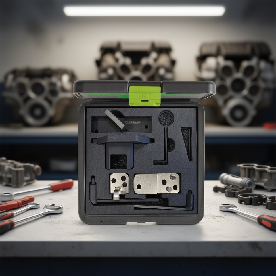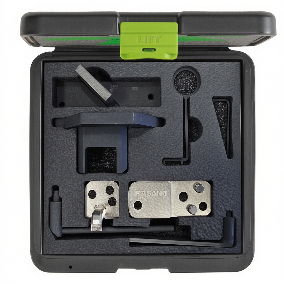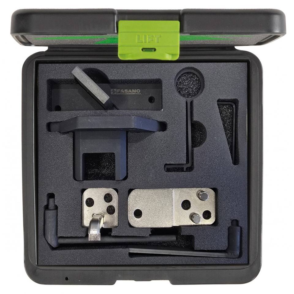 Kit de herramientas de sincronización del motor Fasano para alineación del árbol de levas de 192 mm con componentes metálicos de precisión y estuche de almacenamiento con inserto de espuma