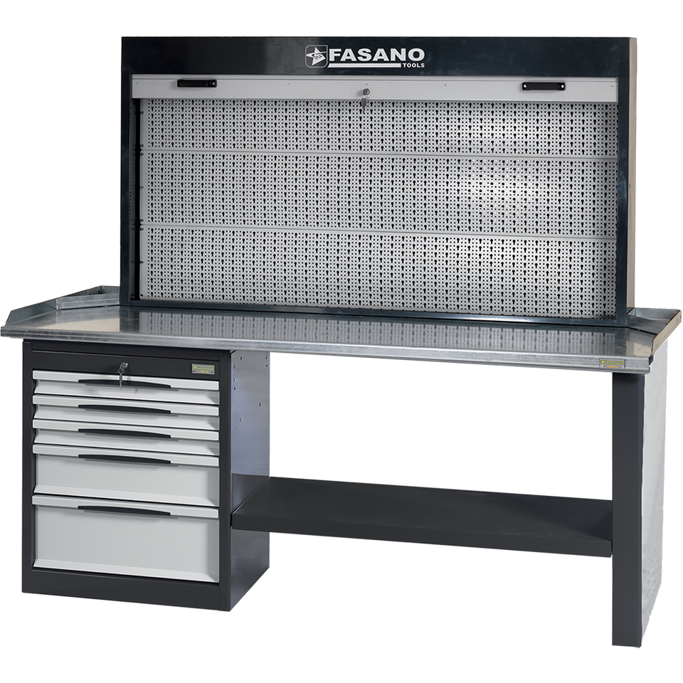 Banco de trabajo Fasano Tools con panel trasero perforado y cajones para reparación de automóviles