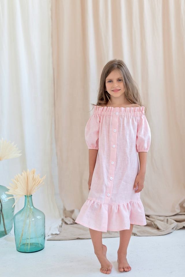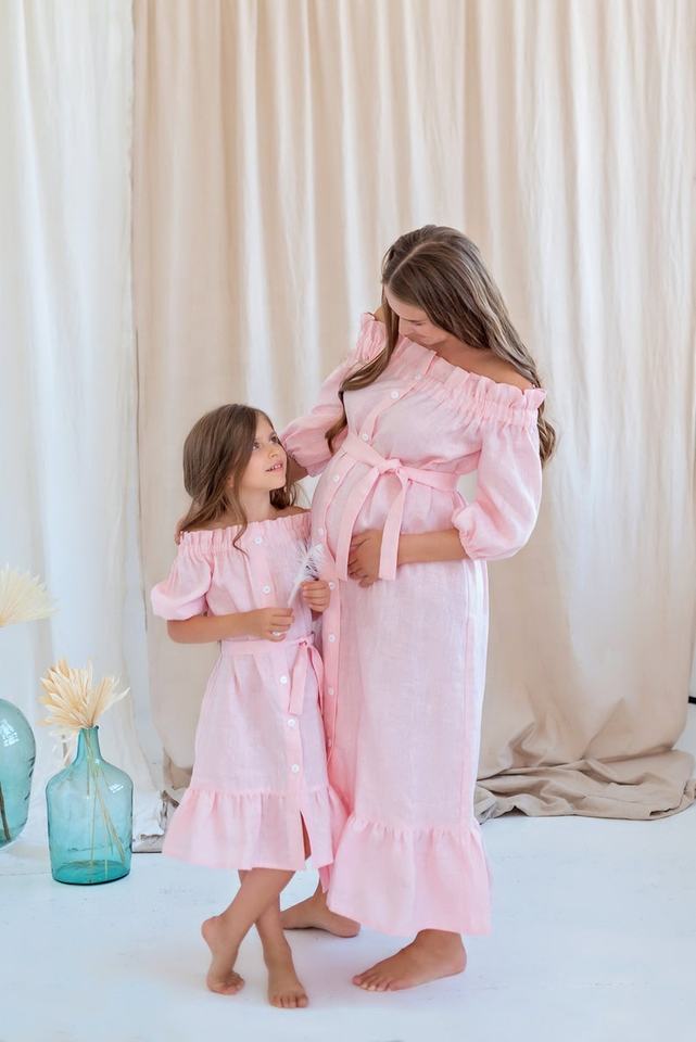 Fascinante Blush Pink Mum & Me vestido a juego cinturón de hombro abierto con botones frontales y banda elástica suave para niños