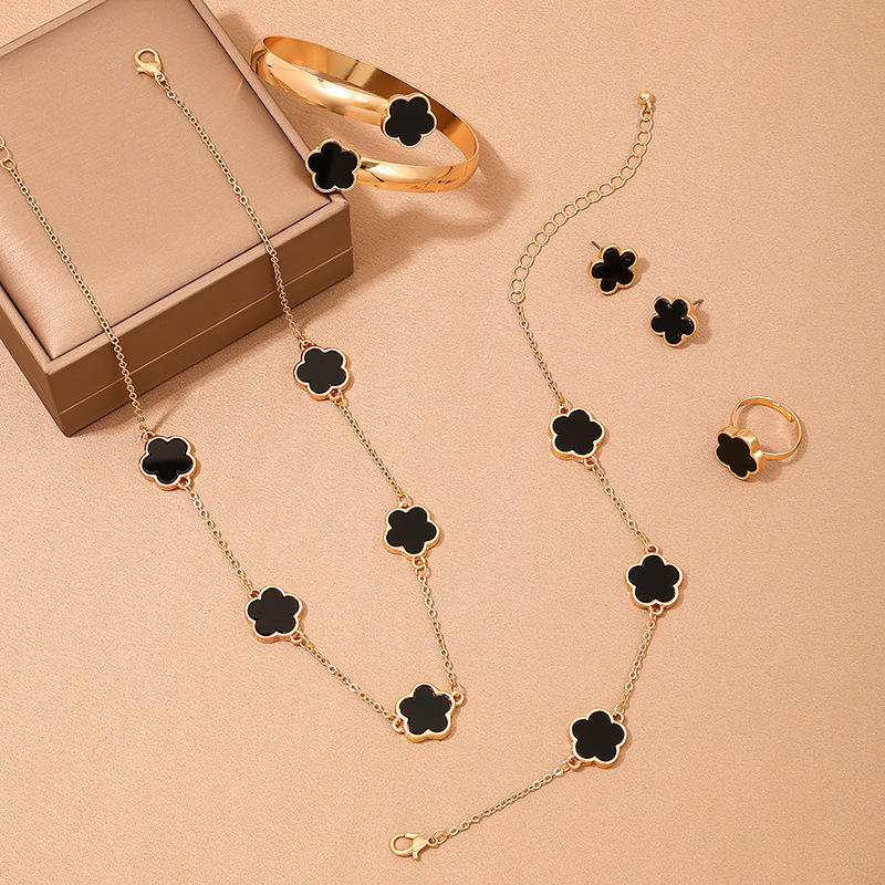 Conjunto de Joyería para Mujer de Aleación con Flor de Trébol a la Moda: Pulsera, Collar, Pendientes y Anillo