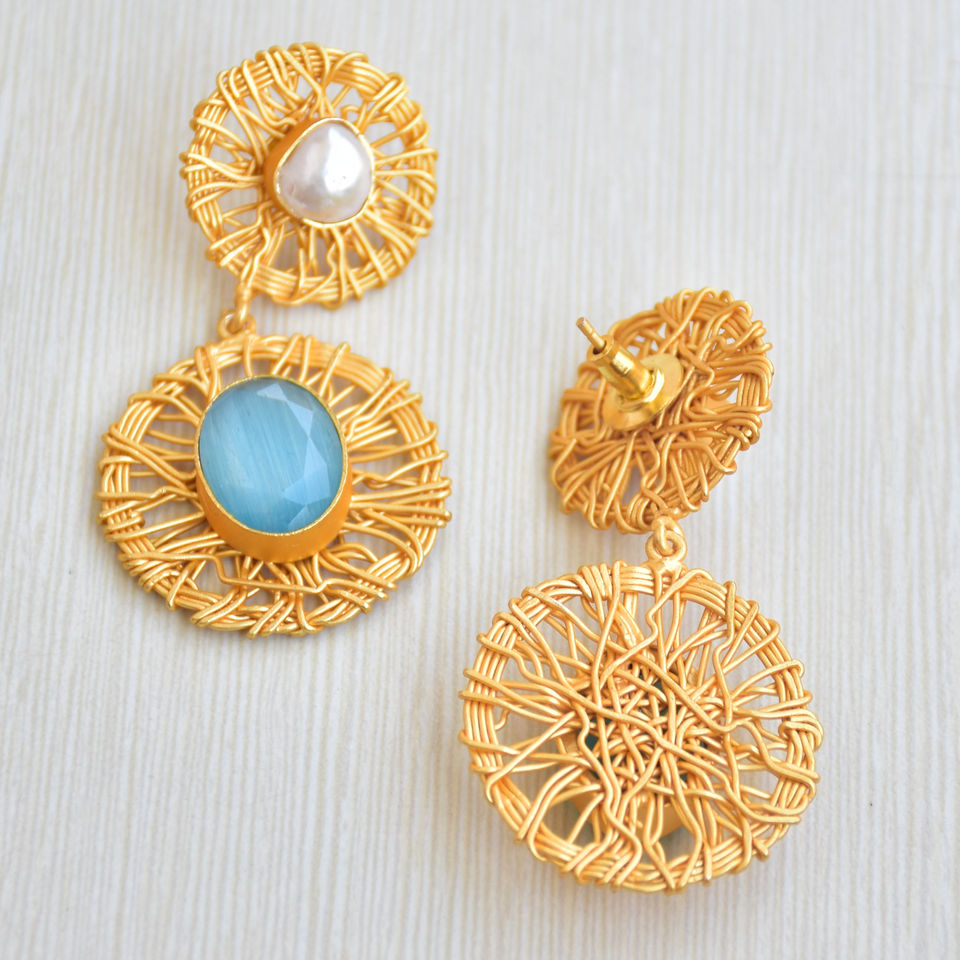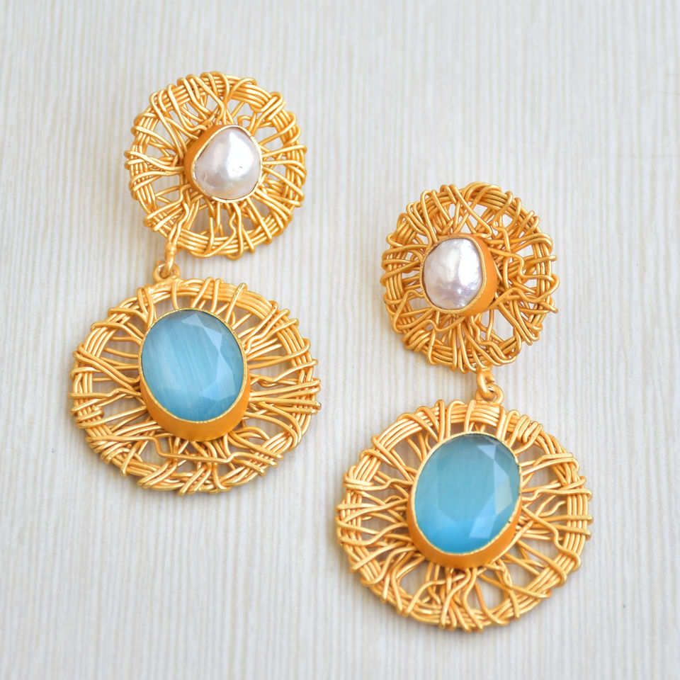Pendientes Colgantes de Latón de Moda, Diseño de Piedra Natural en Bruto con Perla de Exportación, Acabado Chapado en Oro de 18K, Diseño Boho Chic, Perfecto para Venta al por Mayor