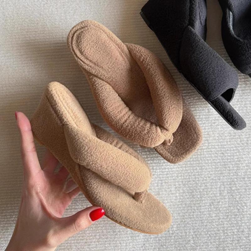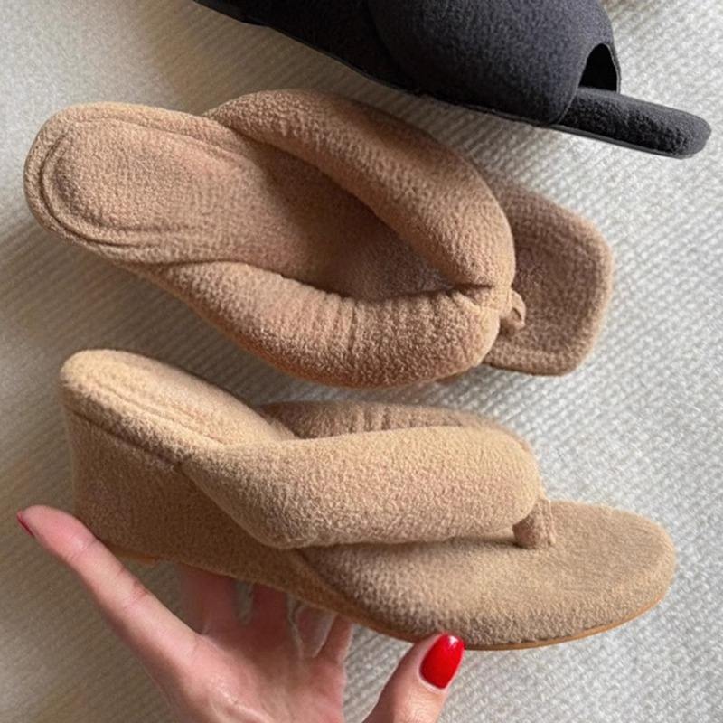 Moda logotipo personalizado punta redonda Tanga cuña zapatillas verano playa chanclas inflable piel mujeres Sandalias de tacón alto
