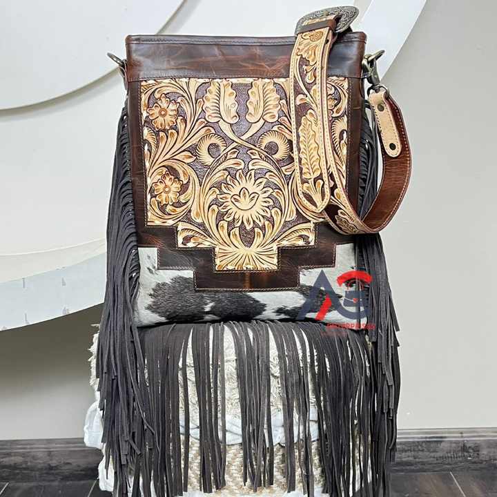 Nombre del producto:Bolso de piel de vaca repujado a mano con flecos