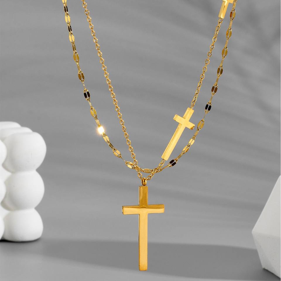 Joyería de moda de acero inoxidable, venta al por mayor, collar de acero de titanio, collar con colgante de doble cruz para mujer