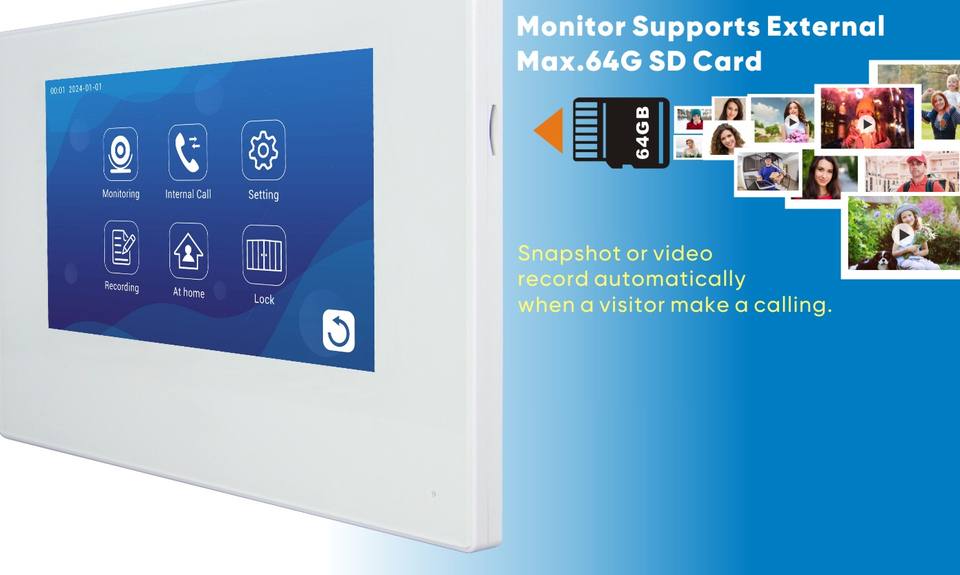 Videoportero Inteligente con Pantalla Táctil FHD de 7 Pulgadas, 4 Cables, Memoria, IP65, Mensaje de Voz, para Casas de 2 Familias