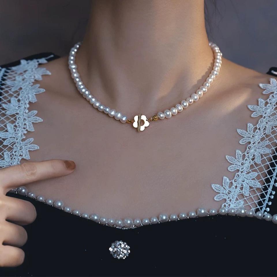 Collar con Hebilla OT de Moda para Mujer, Elegante y Lujoso, Cadena para Clavícula, Perlas Naturales de Agua Dulce, Collares de Perlas