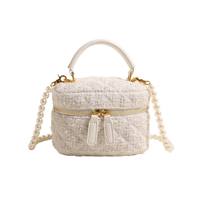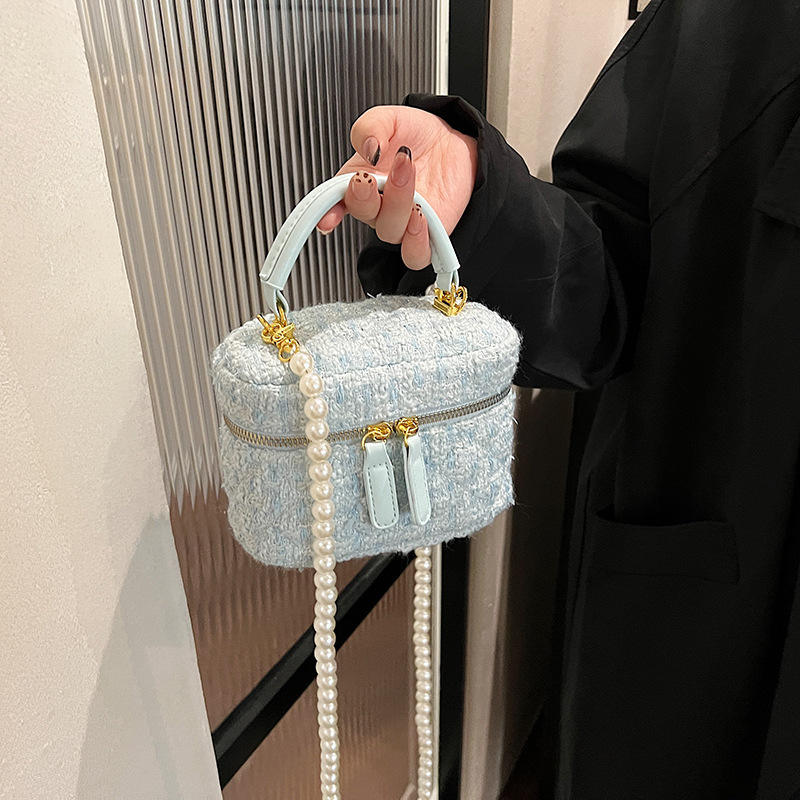 Bolso de mujer de doble propósito de moda en azul claro con diseño de cadena de tweed y perlas