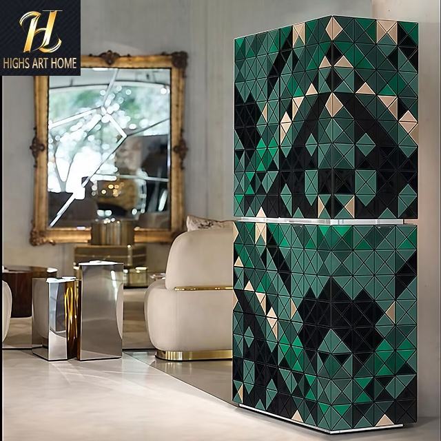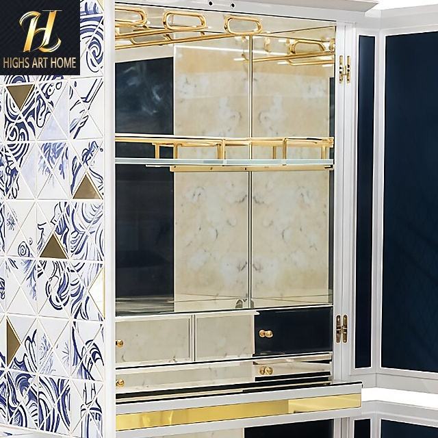 Servicio Rápido de Diseño 3D Portugal: Aparador de Lujo con Pintura Artística Azul y Blanca, Madera Maciza Pixelada y Metal para Sala de Estar, Mueble para Vinos