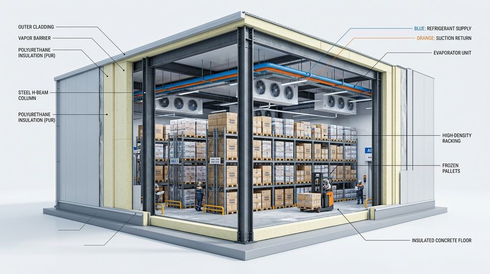 Almacén Industrial de Acero de Gran Envergadura de Montaje Rápido, Cámara Frigorífica Modular con Aislamiento Térmico y Ahorro de Energía
