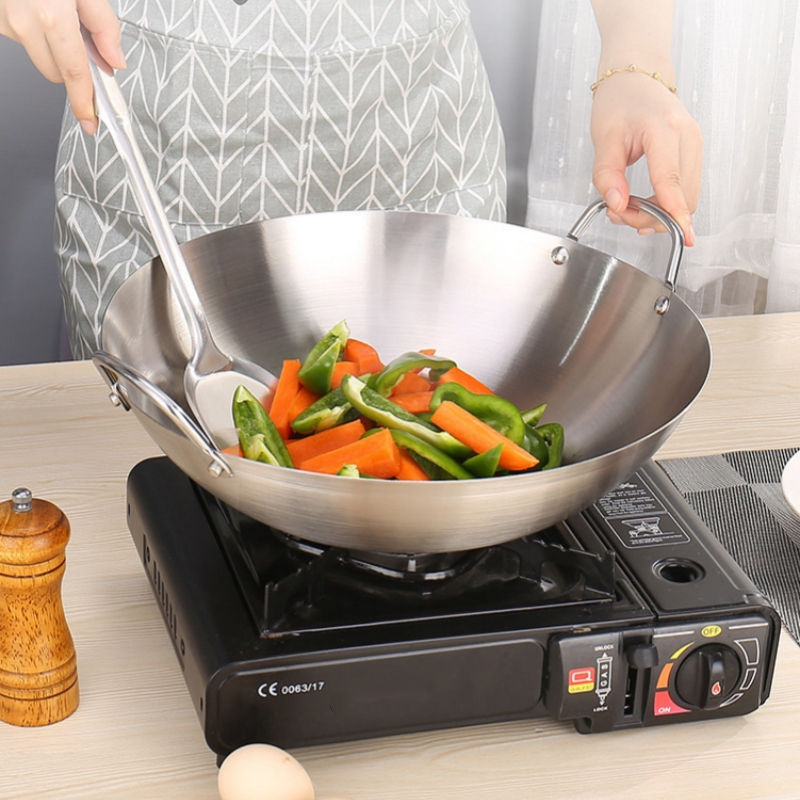 Wok Tradicional Asiático de Calentamiento Rápido, Construcción de Acero Inoxidable, 20L de Gran Capacidad, Mango de Madera, Apto para Lavavajillas