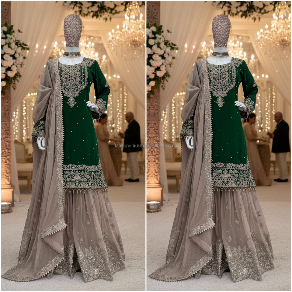Faux Georgette con codificación y trabajo de secuencia con perla y vestido de encaje elegante y Dupatta