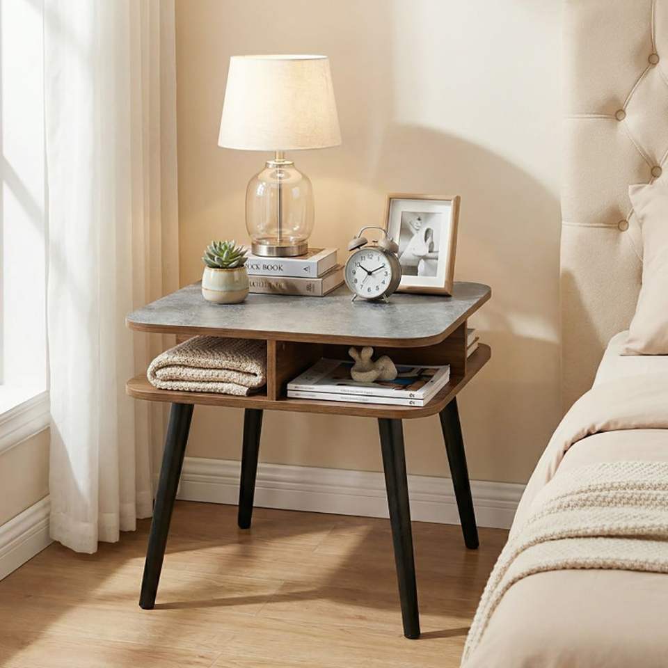 Mesa auxiliar de imitación de mármol con estantes de almacenamiento y patas de madera de caucho, mesa de centro práctica con diseño elegante