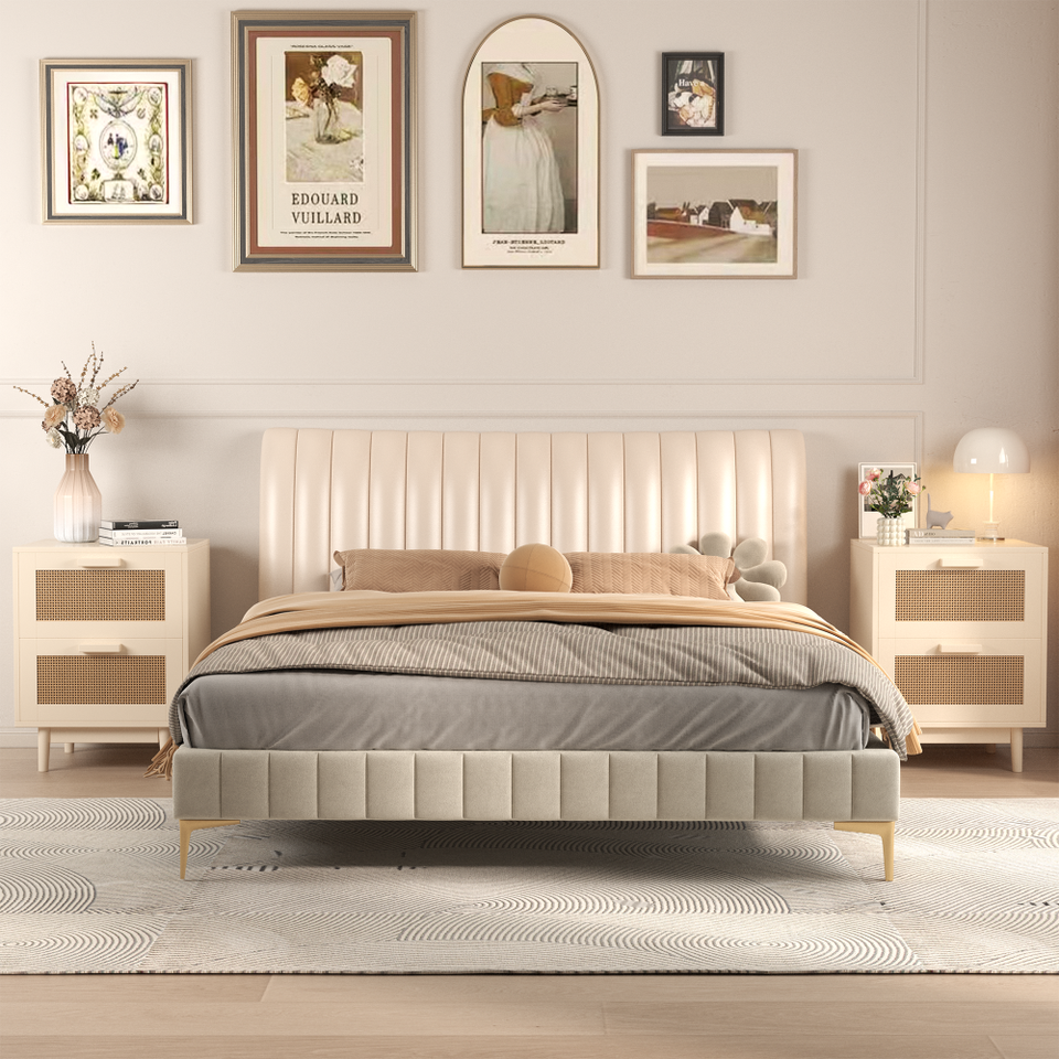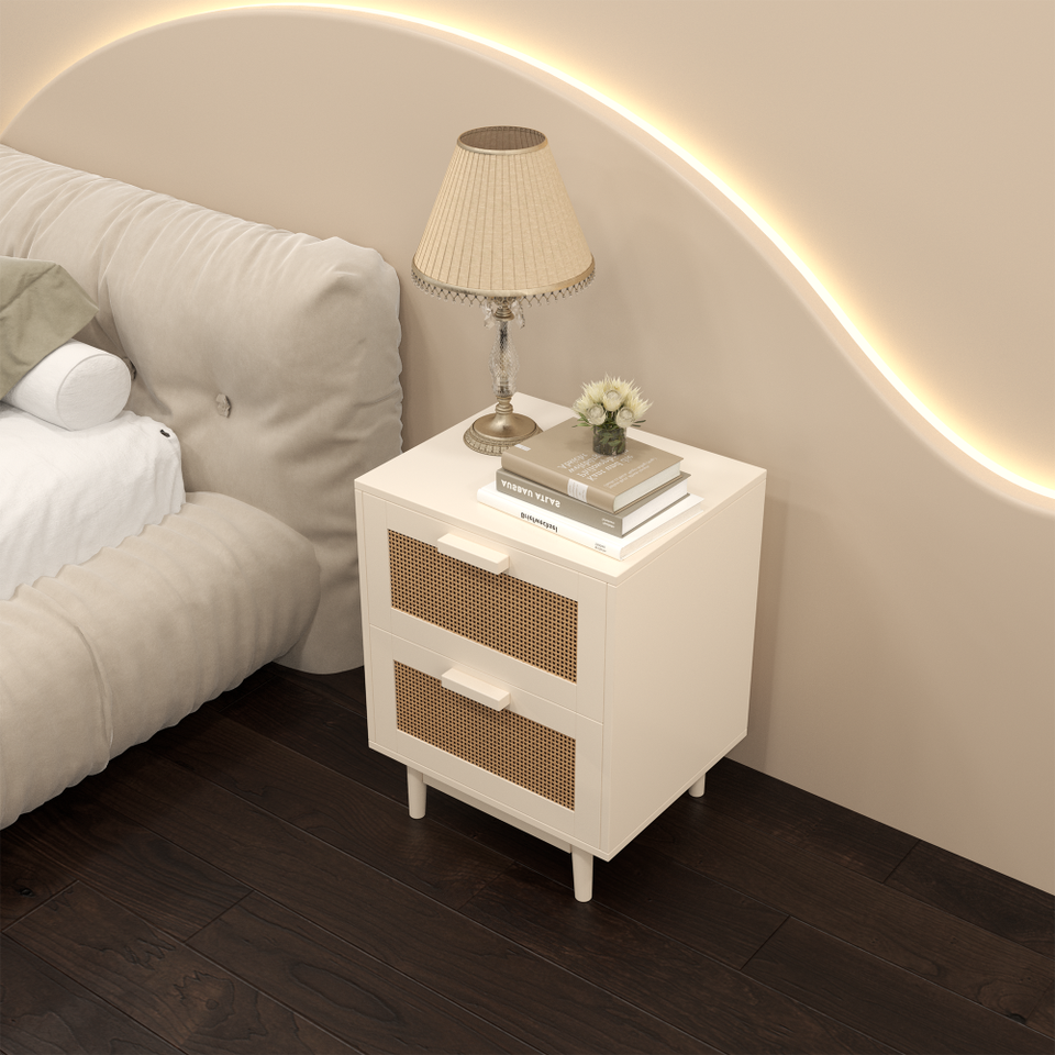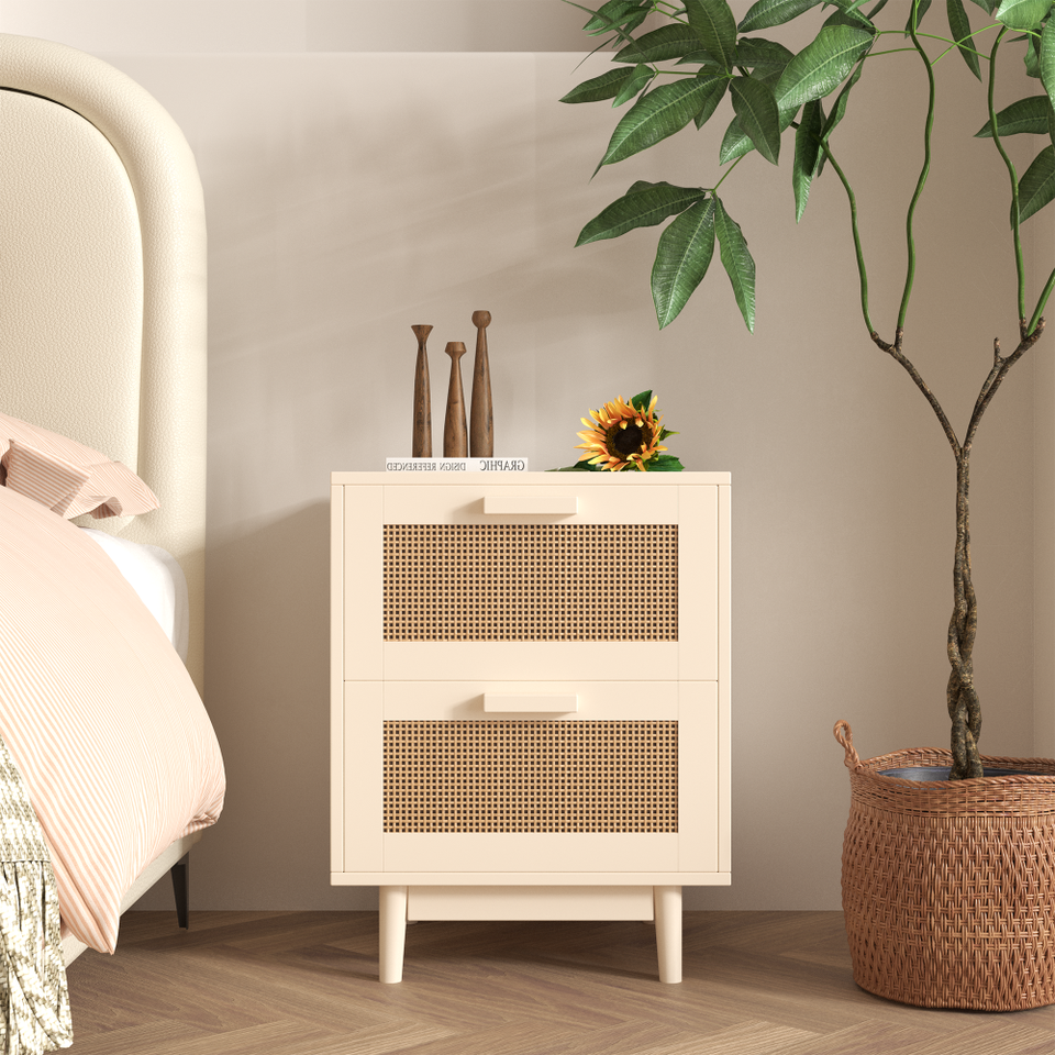 Mesa Auxiliar de Madera con 2 Cajones Decorada con Ratán Sintético, Mesita de Noche y Mesa Decorativa para Apartamento