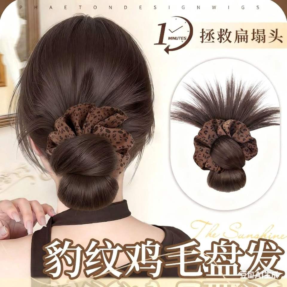 Peluca de moño con plumas y clips, color marrón oscuro con estampado de leopardo, moño bajo para mujer, extensión de cabello