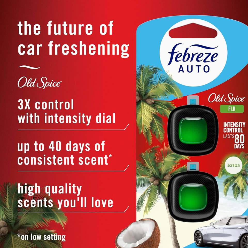 Ambientador para Auto Febreze con Clip para Ventilación, Aroma Old Spice Fiji, 0.07 oz. Clip de Ventilación para Coche, Paquete de 4