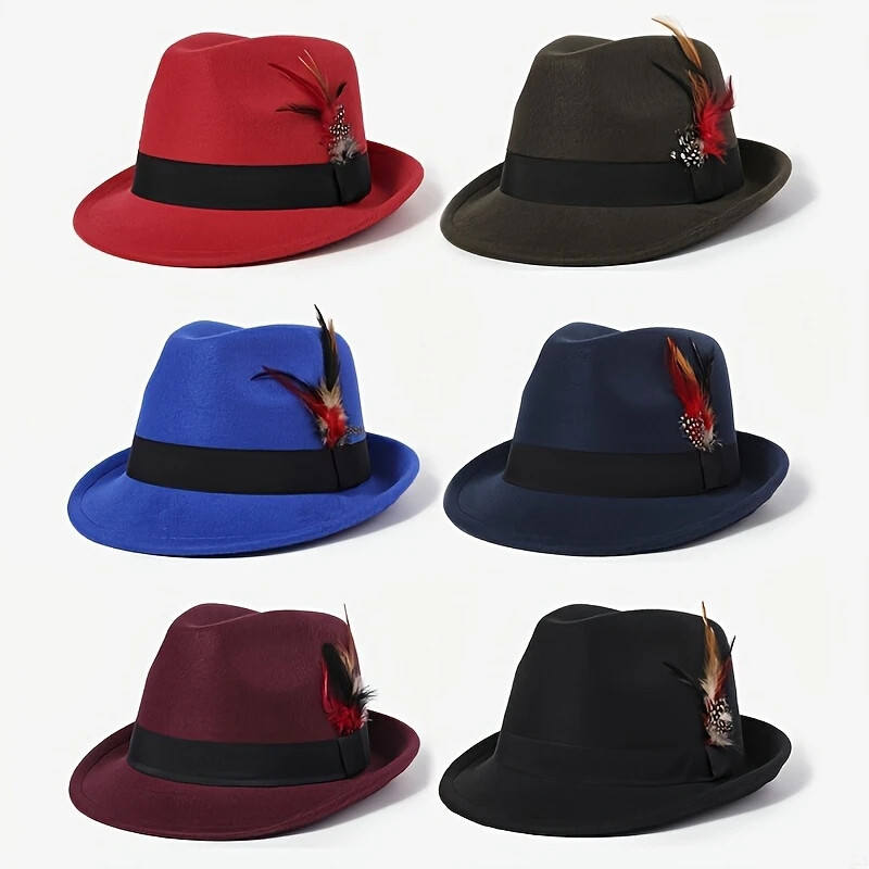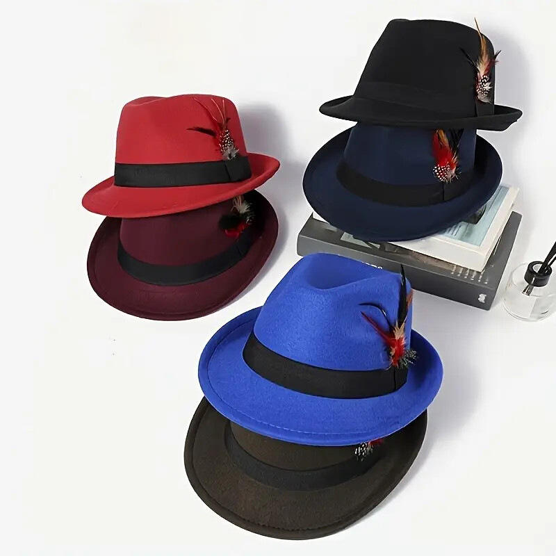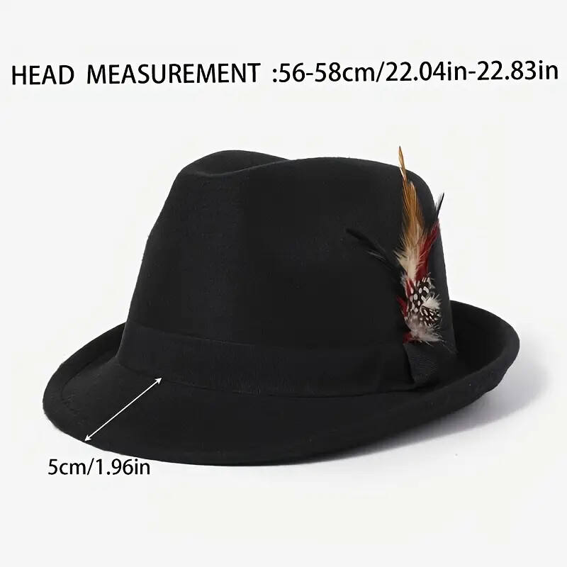 Sombrero Fedora de Fieltro de Lana, Color Sólido, Parte Superior en Forma de Campana con Decoración de Plumas, Estilo Artístico Retro, Sombrero de Caballero para Fiesta