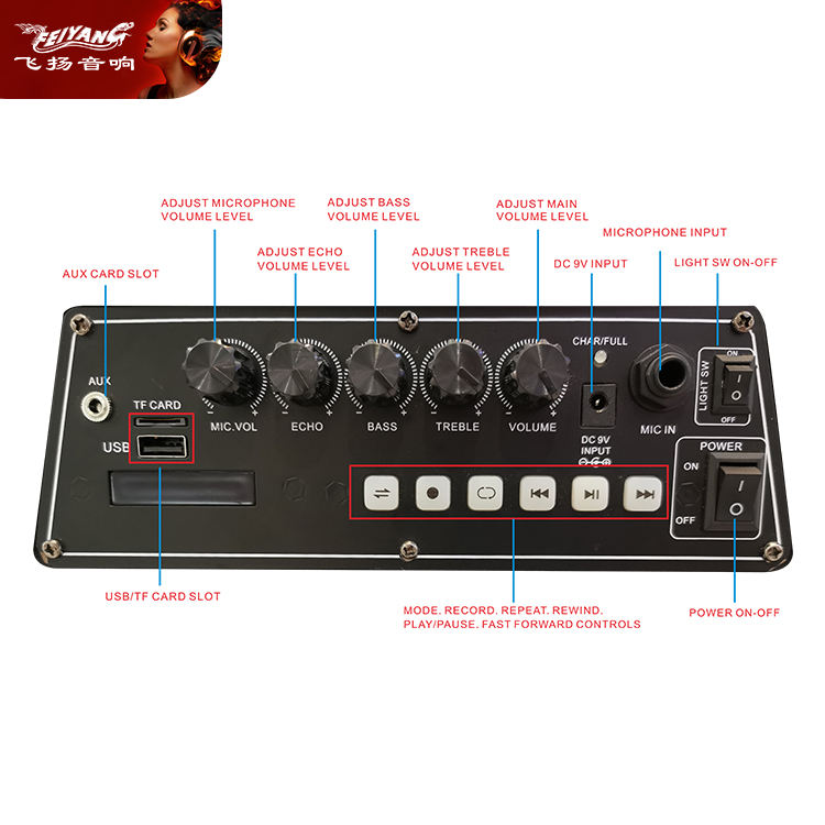 Función:Entrada de TWS/BT/FM/USB/TF/REC/remoto/Mic