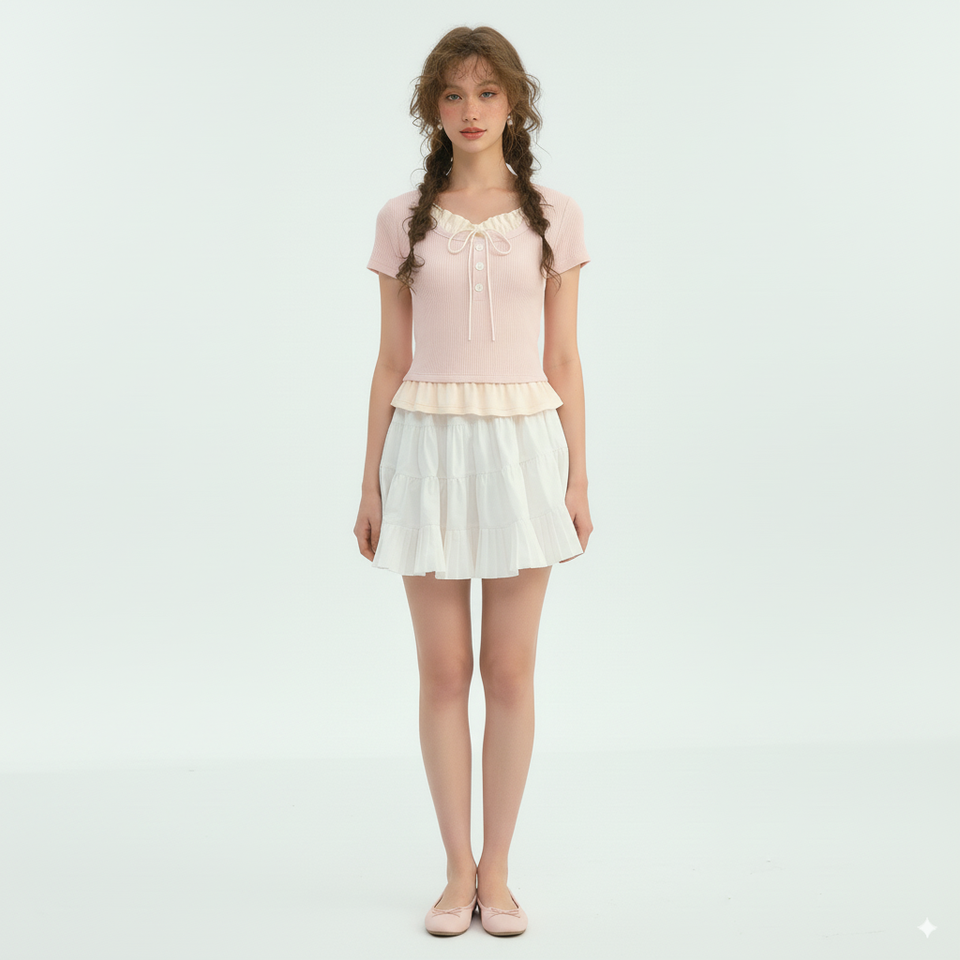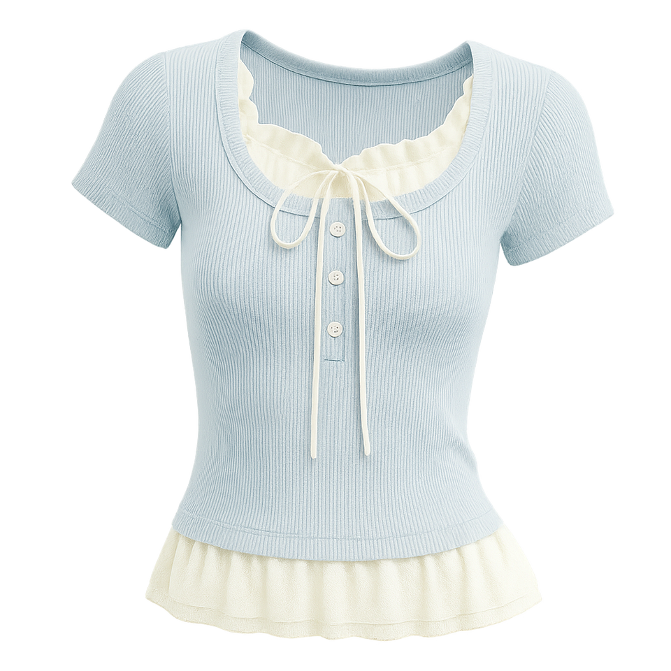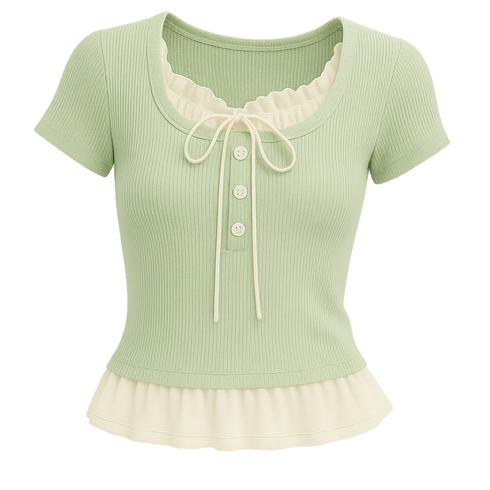 Top de punto de encaje sólido femenino, escote con volantes, Detalle de lazo, acanalado, ajustado, manga corta, estilo dulce, ropa informal transpirable