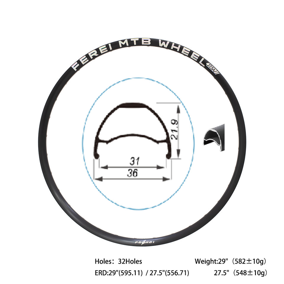 Rueda de Freno de Disco Ferei 27.5/29 de Alta Resistencia AH, 32 Orificios, Aleación de Aluminio de Doble Capa, Ancho de Aro de 30 mm, Clincher/TUBELESS, Delantera/Trasera