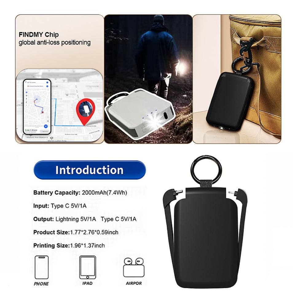 Cargador Portátil de Emergencia con Función de Localización, Mini, 2000 mAh, con Luz, para Llavero, Cargador Portátil para Exteriores