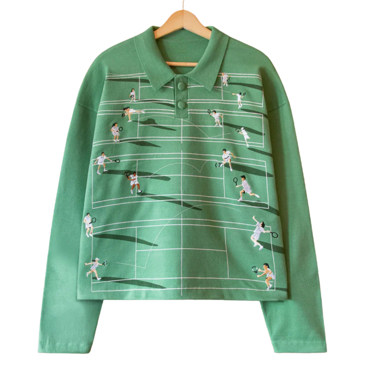 Suéter de Tenis de Punto Fino, Hilo de Textura Suave, Diseño Gráfico de Cancha, Ropa de Invierno Premium, Ajuste Casual y Relajado