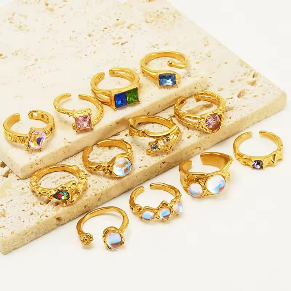 Anillos Abiertos Irregulares de Ópalo Fino, Conjunto de Joyería para San Valentín, Esmeralda Rosa Multicolor, Grabado, Anillo de Dedo de Cristal para Mujer y Hombre