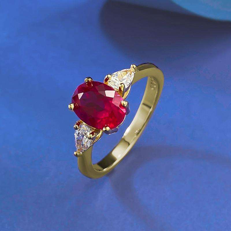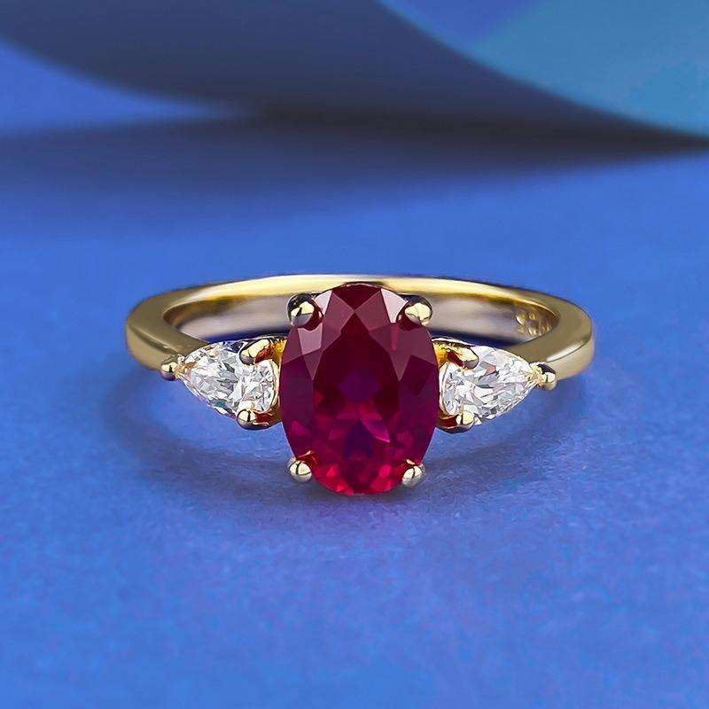 Nombre del Producto:Anillo de compromiso de oro de 14 quilates con tres piedras, rubí ovalado y diamante en forma de pera