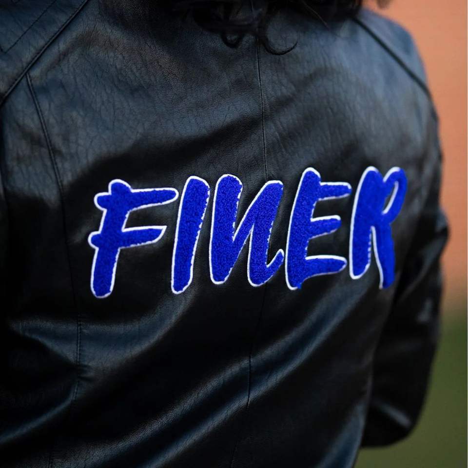 Chaqueta de motorista más fina con texto bordado en negrita para el estilo de hermandad Edgy y declaraciones de moda de la vida griega