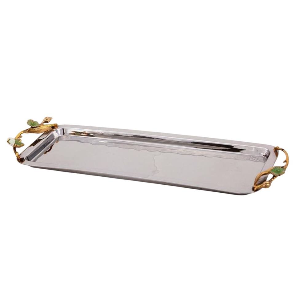 Bandeja Rectangular de Acero Inoxidable de la Mejor Calidad con Asa de Hoja de Roble, Acabado Plateado Pulido, Plato de Servicio Metálico
